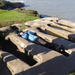 A Saxon doorway leads to St Patrick’s Chapel, a place of retreat on top of the headland. It would have been a great place for contemplation with its views over Morecambe Bay and the hills of the Lake District. Another of Heysham’s treasures are the six rock-cut graves. Nobody knows their origin but they are certainly unique and could be tranquil places to end ones days under ever changing skies. Perhaps there were sky burials here although the less romantic archaeological explanation is that they were probably reliquaries for bones and other materials as they were not big enough for bodies but, as demonstrated below, they appear to be big enough for female bodies. The holes at the head were for crosses. An excavation on the land below the rock graves in 1993 revealed many artefacts from some 12,000 years ago and as the land was thought to be an important Mesolithic site it was back-filled to preserve it for future research.